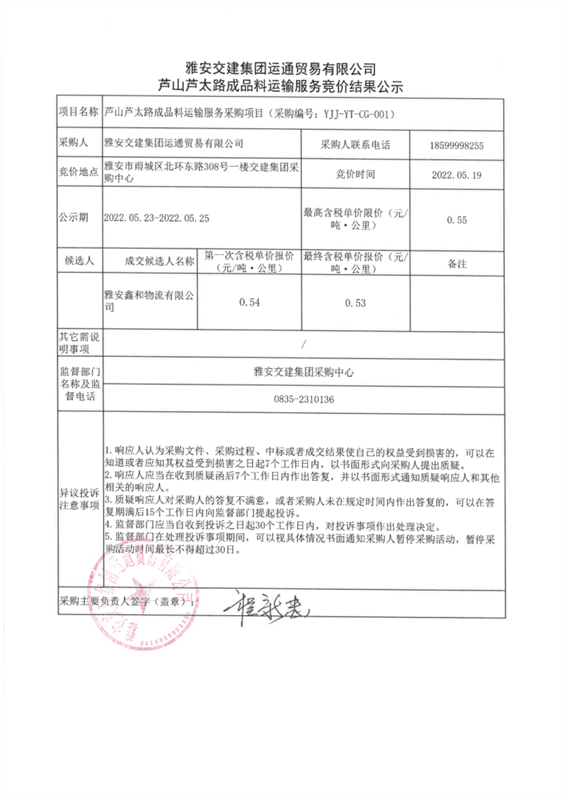 雅安交建集團運通貿易有限公司蘆山蘆太路成品料運輸服務競價結果公示