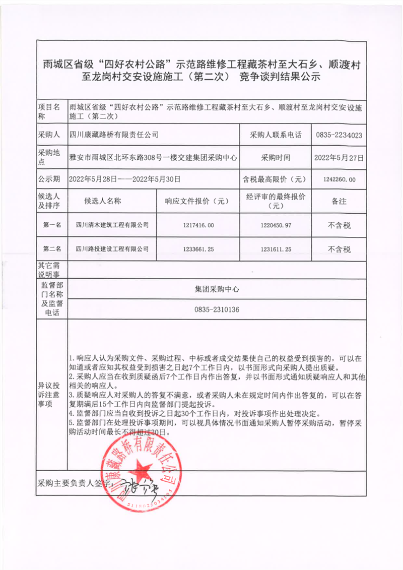 四川康藏路橋有限責任公司雨城區(qū)省級“四好農(nóng)村公路”示范路維修工程藏茶村至大石鄉(xiāng)、順渡村至龍崗村交安設施施工(第二次)競爭談判結果公示