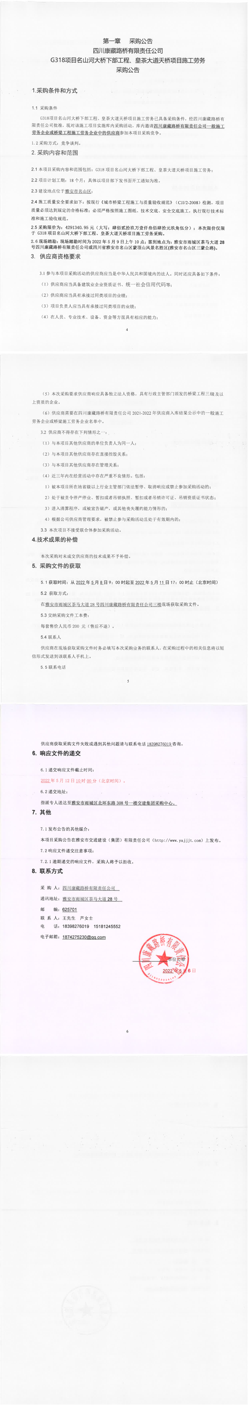 四川康藏路橋有限責(zé)任公司G318項(xiàng)目名山河大橋下部工程、皇茶大道天橋項(xiàng)目施工勞務(wù)采購(gòu)公告