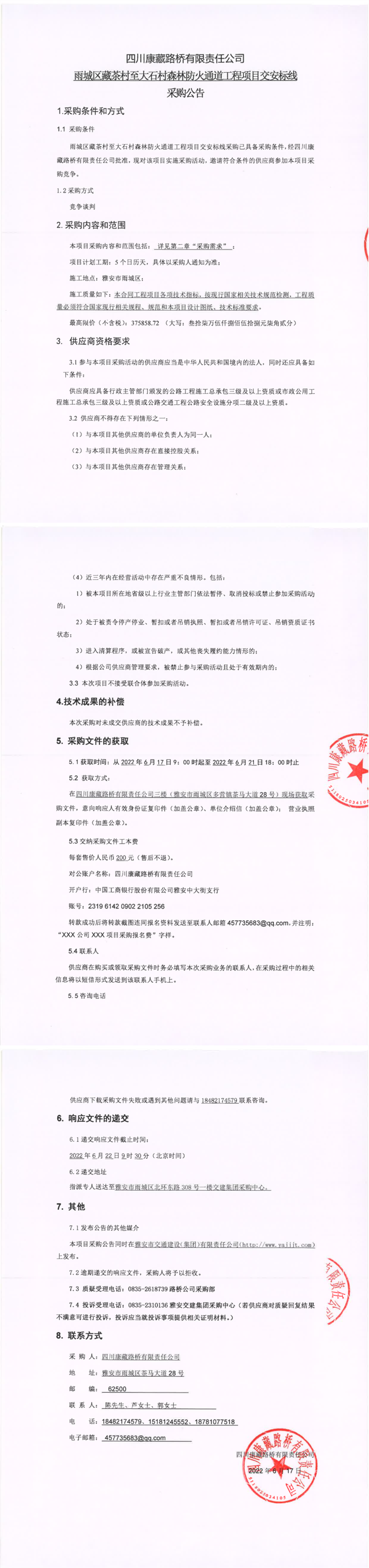 四川康藏路橋有限責任公司雨城區(qū)藏茶村至大石村森林防火通道工程項目交安標線采購公告