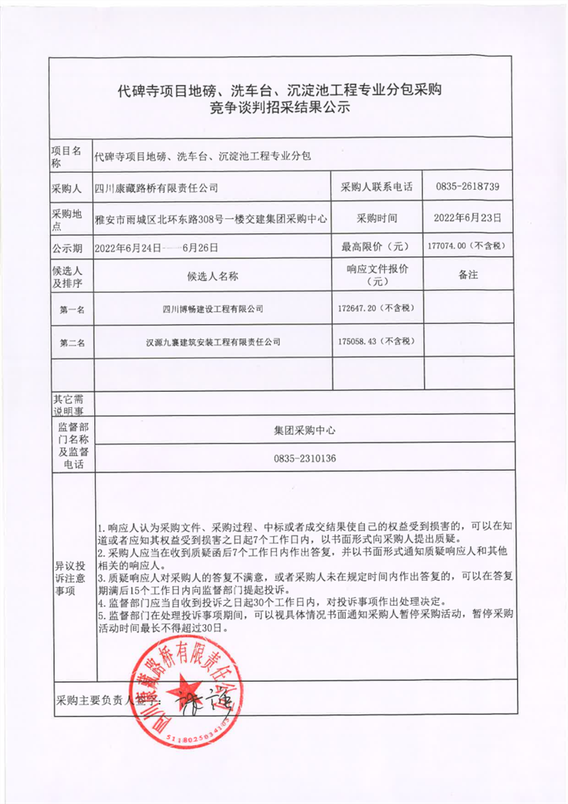 四川康藏路橋有限責(zé)任公司代碑寺項目地磅、洗車臺、沉淀池工程專業(yè)分包采購競爭談判招采結(jié)果公示