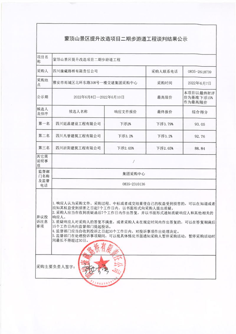 四川康藏路橋有限責任公司蒙頂山景區(qū)提升改造項目二期步游道工程談判結(jié)果公示