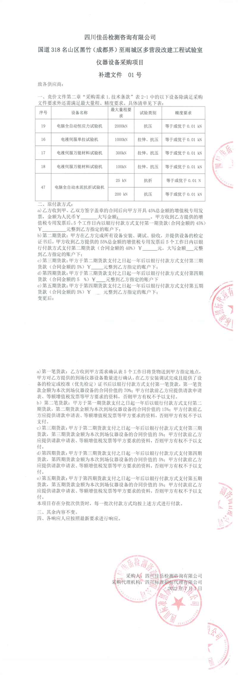 四川佳岳檢測咨詢有限公司國道318名山區(qū)黑竹(成都界)至雨城區(qū)多營段改建工程試驗(yàn)室儀器設(shè)備采購項(xiàng)目補(bǔ)遺文件01號(hào)