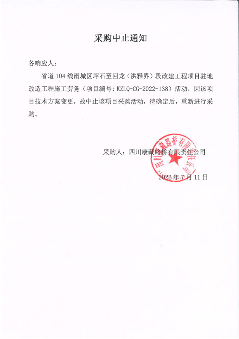 四川康藏路橋有限責(zé)任公司省道104線雨城區(qū)坪石至回龍(洪雅界)段改建工程項目駐地改造工程施工勞務(wù)采購中止通知