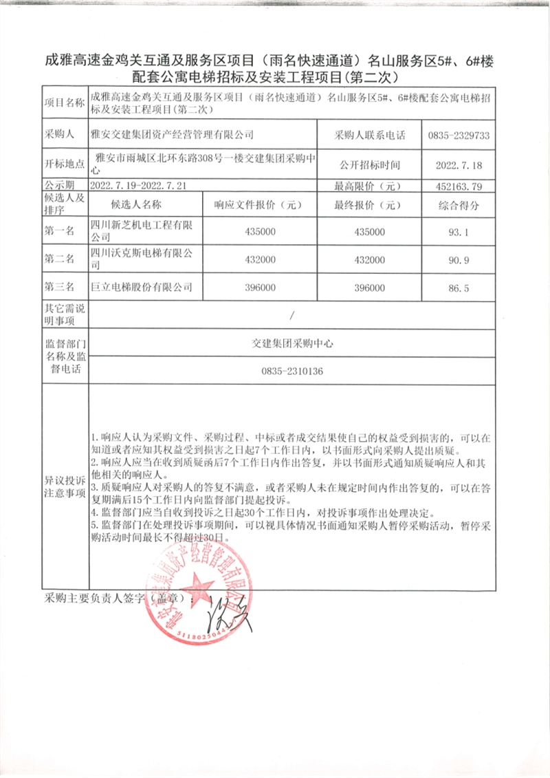 雅安交建集團資產(chǎn)經(jīng)營管理有限公司成雅高速金雞關互通及服務區(qū)項目(雨名快速通道)名山服務區(qū)5#、6#樓配套公寓電梯招標及安裝工程項目招標公告(第二次)結(jié)果公示