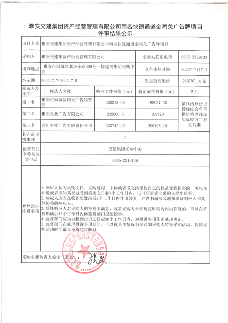 雅安交建集團(tuán)資產(chǎn)經(jīng)營管理有限公司雨名快速通道金雞關(guān)廣告牌項(xiàng)目評審結(jié)果公示