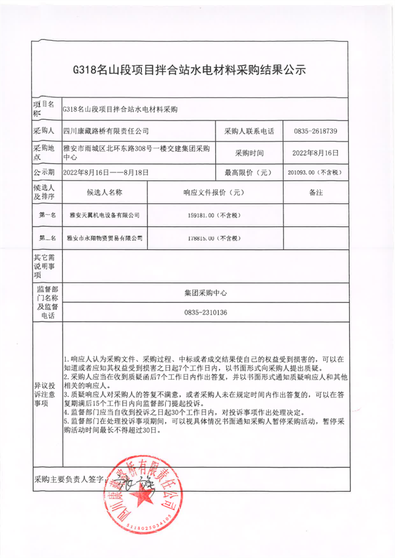 四川康藏路橋有限責任公司G318名山段項目拌合站水電材料采購結(jié)果公示