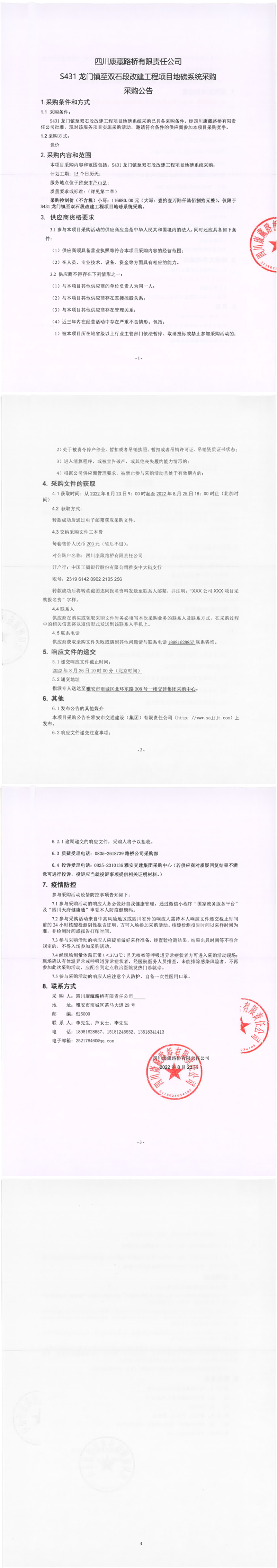 四川康藏路橋有限責(zé)任公司S431龍門鎮(zhèn)至雙石段改建工程項(xiàng)目地磅系統(tǒng)采購采購公告