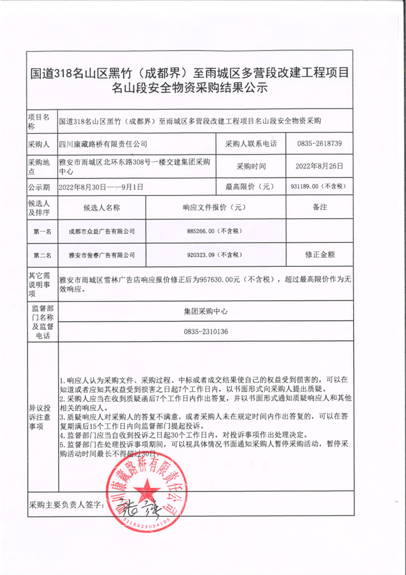 四川康藏路橋有限責(zé)任公司國道318名山區(qū)黑竹(成都界)至雨城區(qū)多營段改建工程項(xiàng)目名山段安全物資采購結(jié)果公示