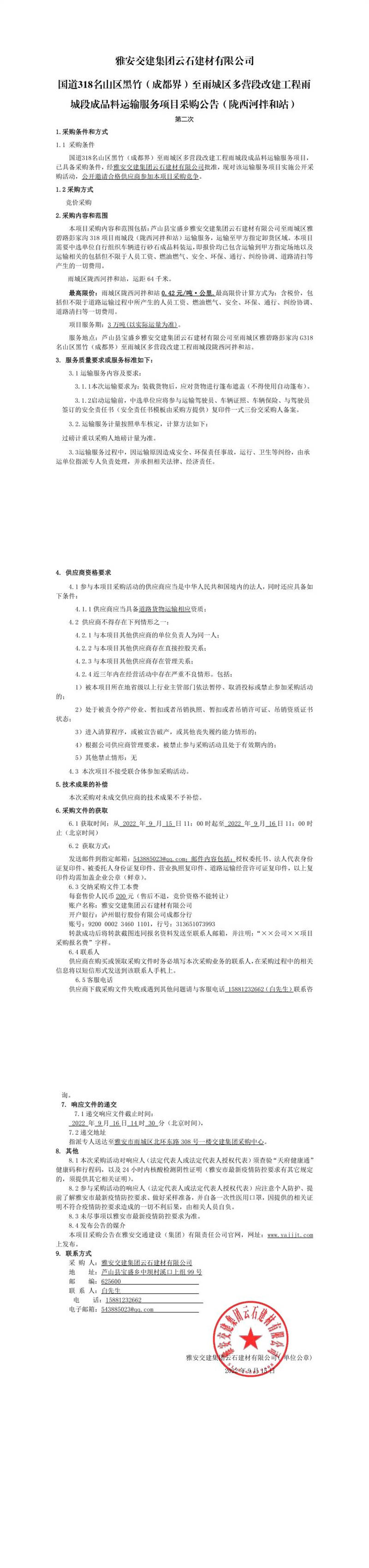 雅安交建集團云石建材有限公司國道318名山區(qū)黑竹(成都界)至雨城區(qū)多營段改建工程名山段成品料運輸服務項目采購公告(皇茶大道拌和站)