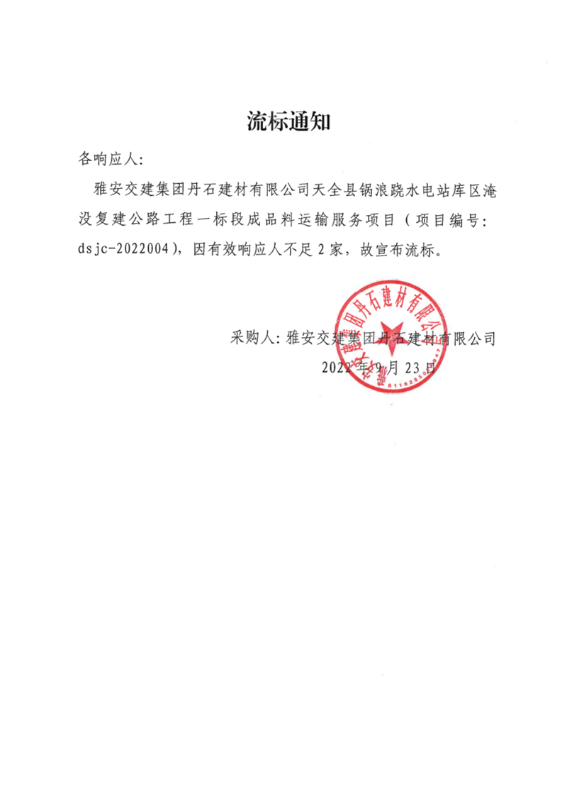 雅安交建集團丹石建材有限公司天全縣鍋浪蹺水電站庫區(qū)淹沒復建公路工程一標段成品料運輸服務項目流標通知