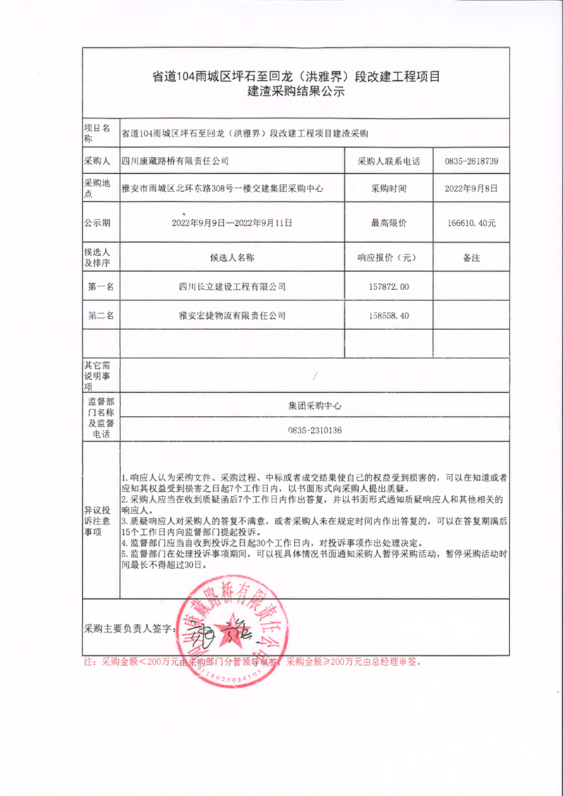 四川康藏路橋有限責(zé)任公司省道104雨城區(qū)坪石至回龍(洪雅界)段改建工程項目建渣采購結(jié)果公示