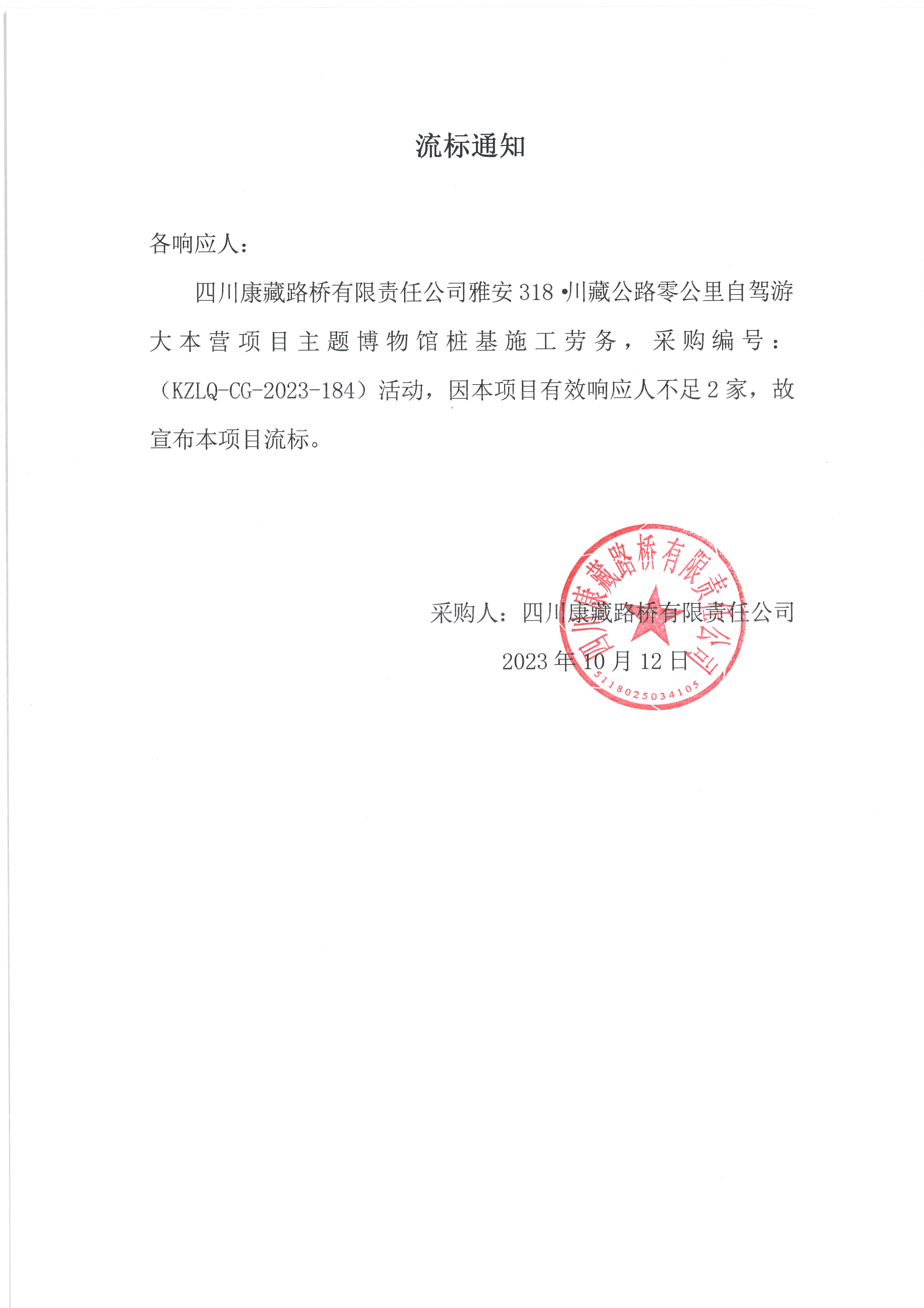 四川康藏路橋有限責(zé)任公司雅安318·川藏公路零公里自駕游大本營(yíng)項(xiàng)目主題博物館樁基施工勞務(wù)流標(biāo)通知