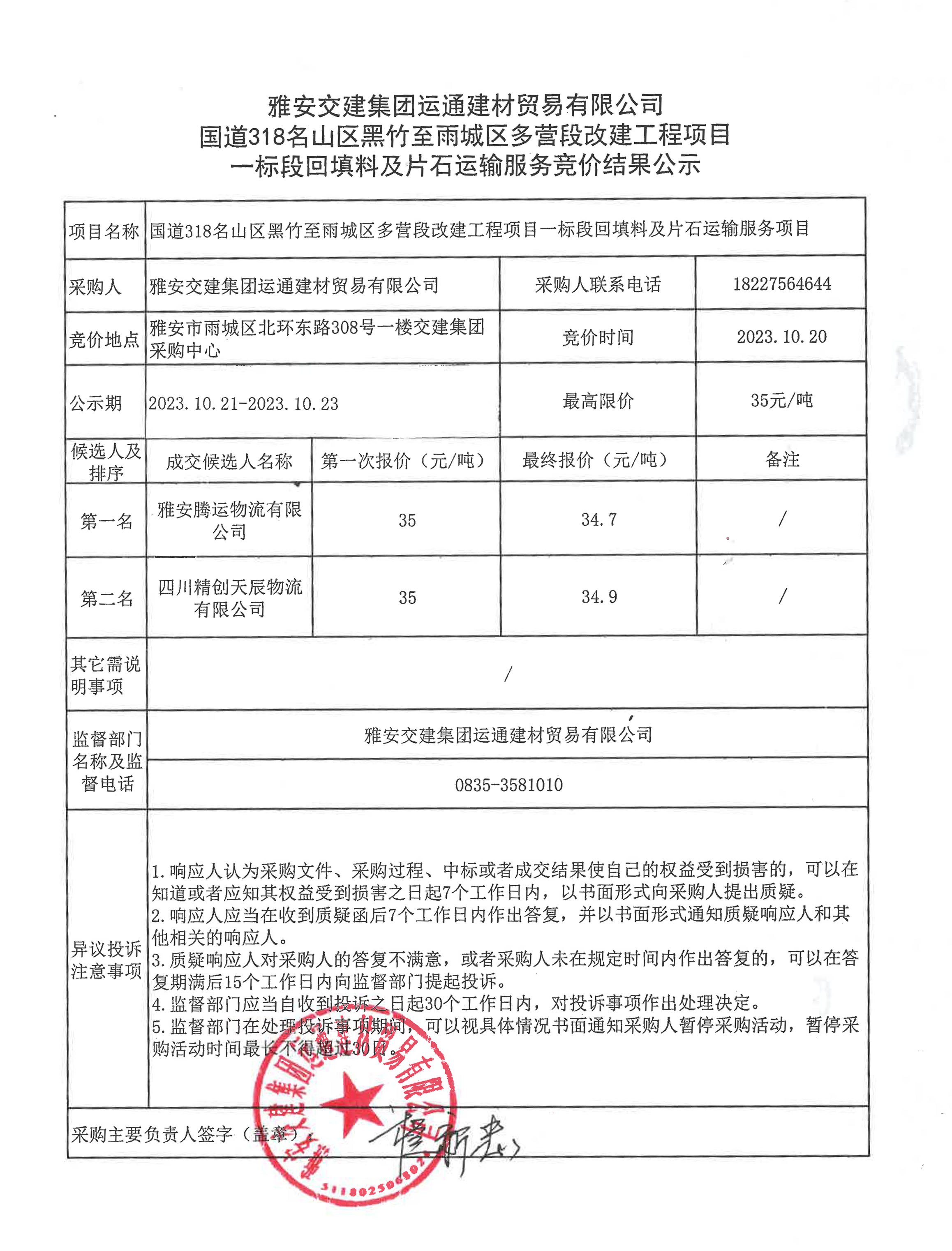 雅安交建集團(tuán)運(yùn)通建材貿(mào)易有限公司 國道318名山區(qū)黑竹至雨城區(qū)多營段改建工程項(xiàng)目一標(biāo)段回填料及片石運(yùn)輸服務(wù)競價結(jié)果公示
