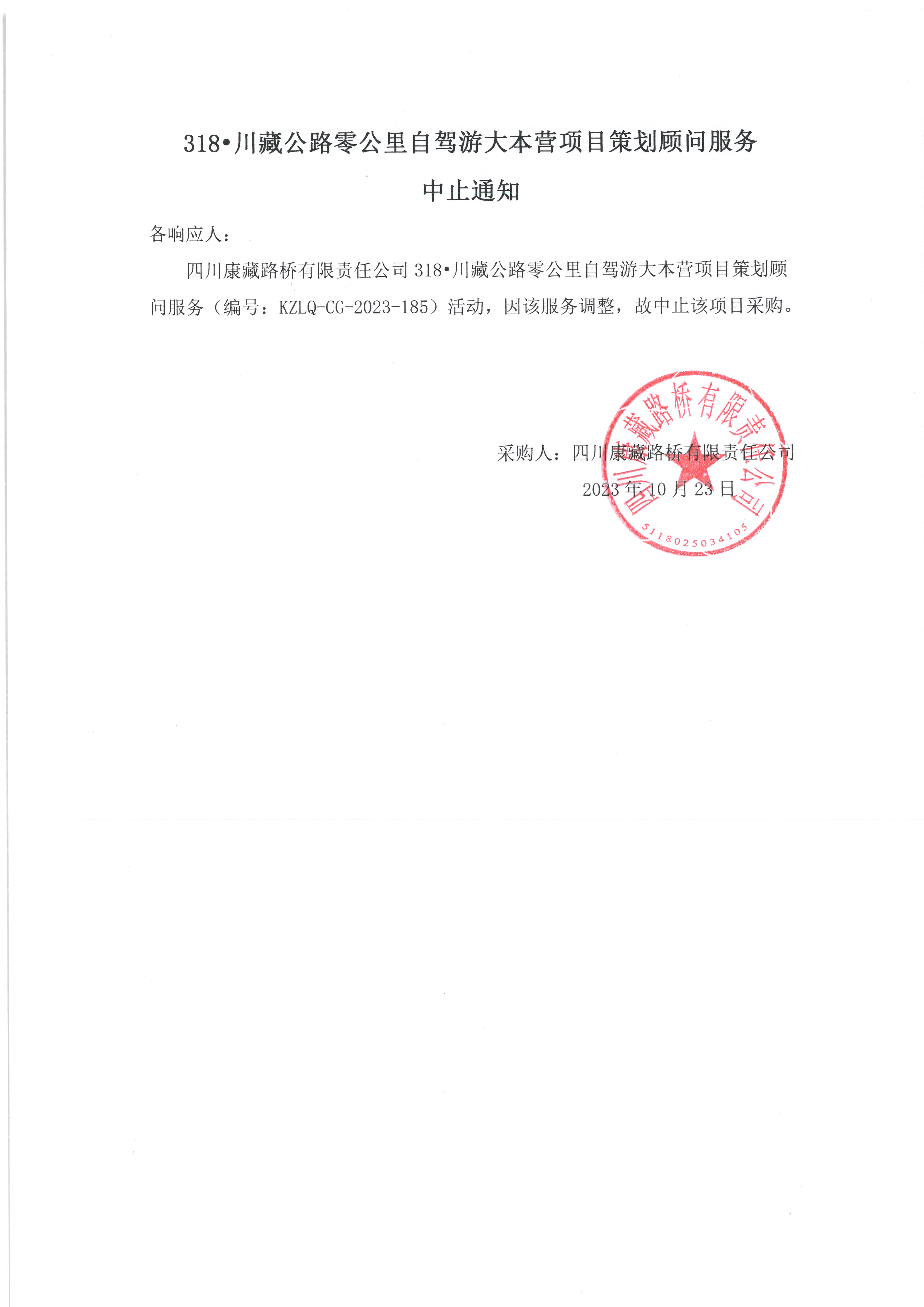 四川康藏路橋有限責(zé)任公司318•川藏公路零公里自駕游大本營(yíng)項(xiàng)目策劃顧問服務(wù)中止通知