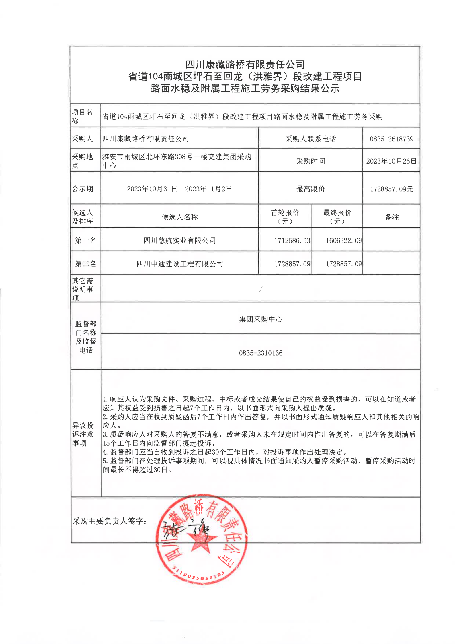四川康藏路橋有限責(zé)任公司省道104雨城區(qū)坪石至回龍(洪雅界)段改建工程項(xiàng)目路面水穩(wěn)及附屬工程施工勞務(wù)采購(gòu)結(jié)果公示
