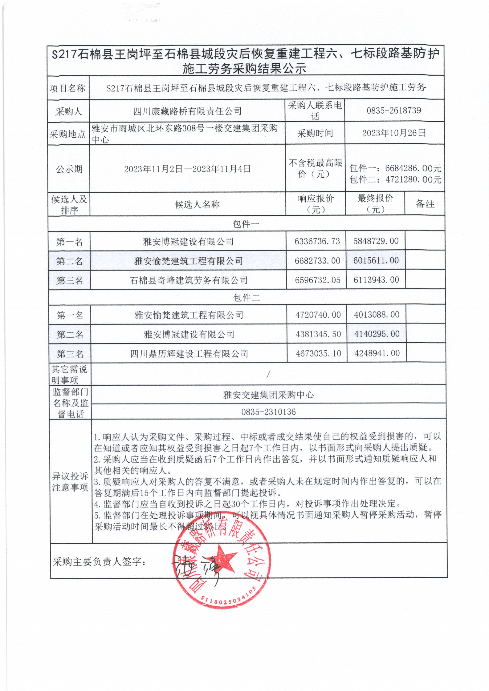 四川康藏路橋有限責(zé)任公司S217石棉縣王崗坪至石棉縣城段災(zāi)后恢復(fù)重建工程六、七標(biāo)段路基防護施工勞務(wù)采購結(jié)果公示
