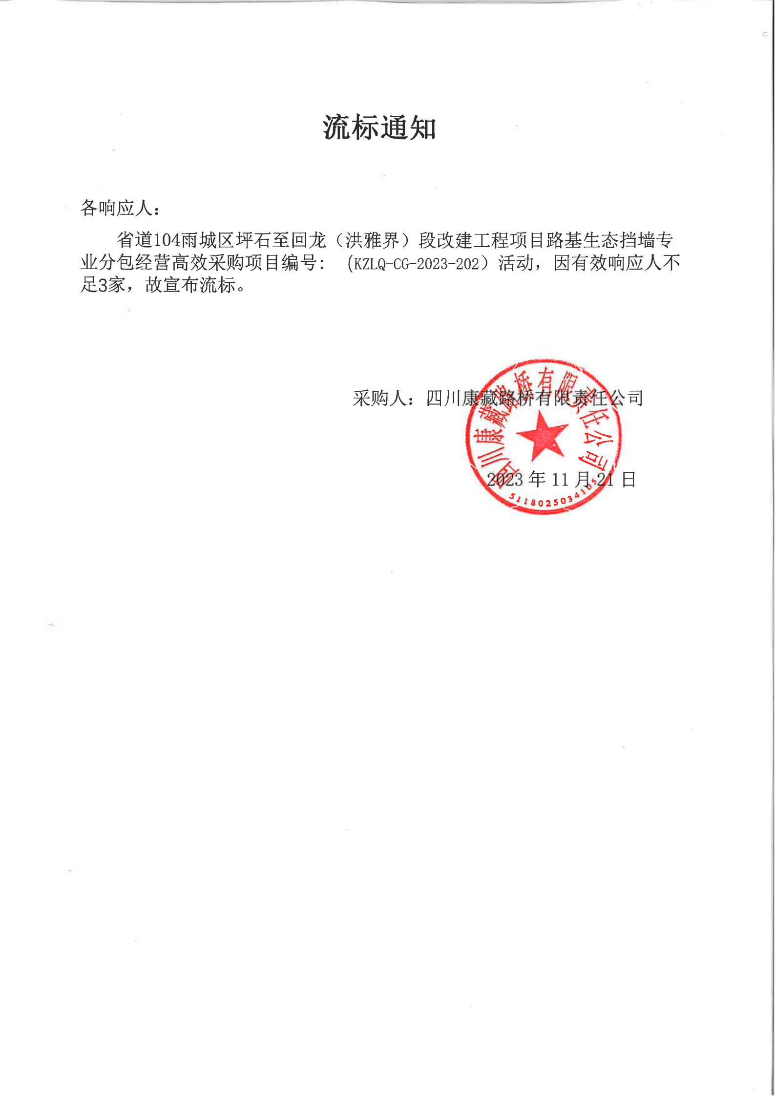 四川康藏路橋有限責(zé)任公司省道104雨城區(qū)坪石至回龍(洪雅界)段改建工程項(xiàng)目路基生態(tài)擋墻專業(yè)分包經(jīng)營高效采購流標(biāo)通知