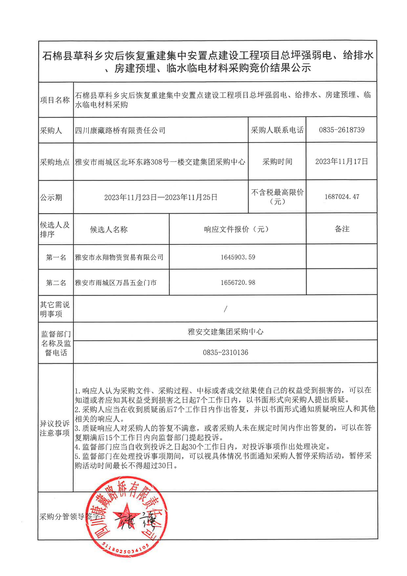 四川康藏路橋有限責(zé)任公司石棉縣草科鄉(xiāng)災(zāi)后恢復(fù)重建集中安置點建設(shè)工程項目總坪強弱電、給排水、房建預(yù)埋、臨水臨電材料采購結(jié)果公示