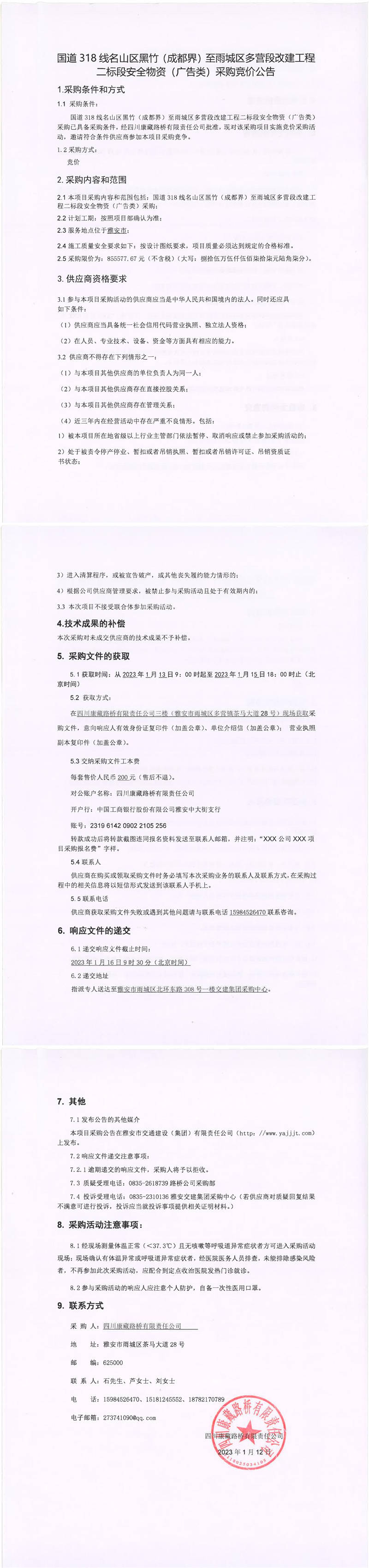 四川康藏路橋有限責(zé)任公司國道318線名山區(qū)黑竹(成都界)至雨城區(qū)多營(yíng)段改建工程二標(biāo)段安全物資(廣告類)采購競(jìng)價(jià)公告
