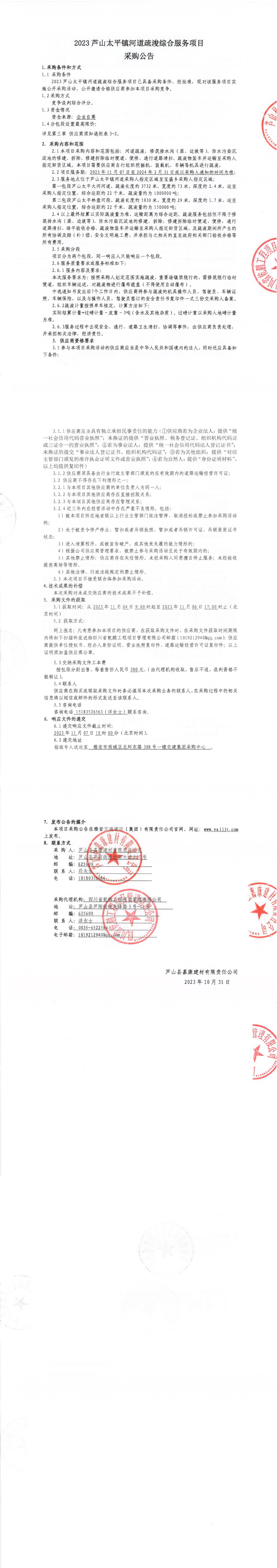 蘆山縣嘉康建材有限責(zé)任公司2023蘆山太平鎮(zhèn)河道疏浚綜合服務(wù)項(xiàng)目采購(gòu)公告