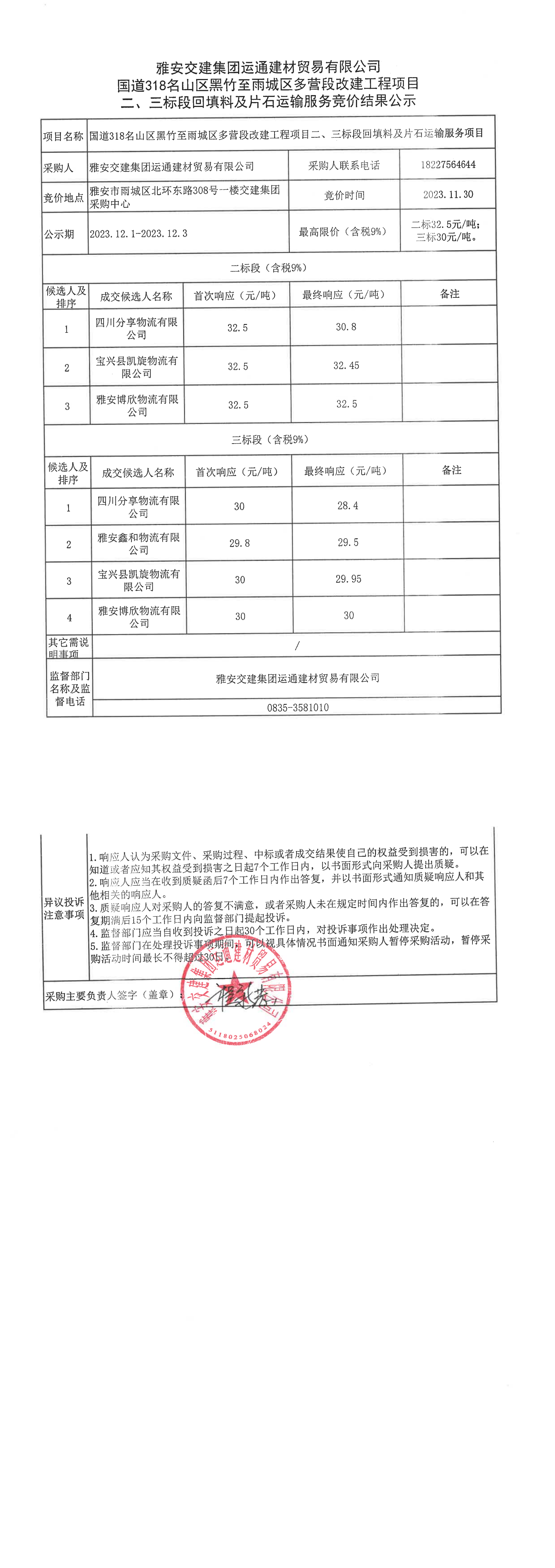 雅安交建集團運通建材貿易有限公司國道318名山區(qū)黑竹至雨城區(qū)多營段改建工程項目二、三標段回填料、片石運輸服務競價結果公示