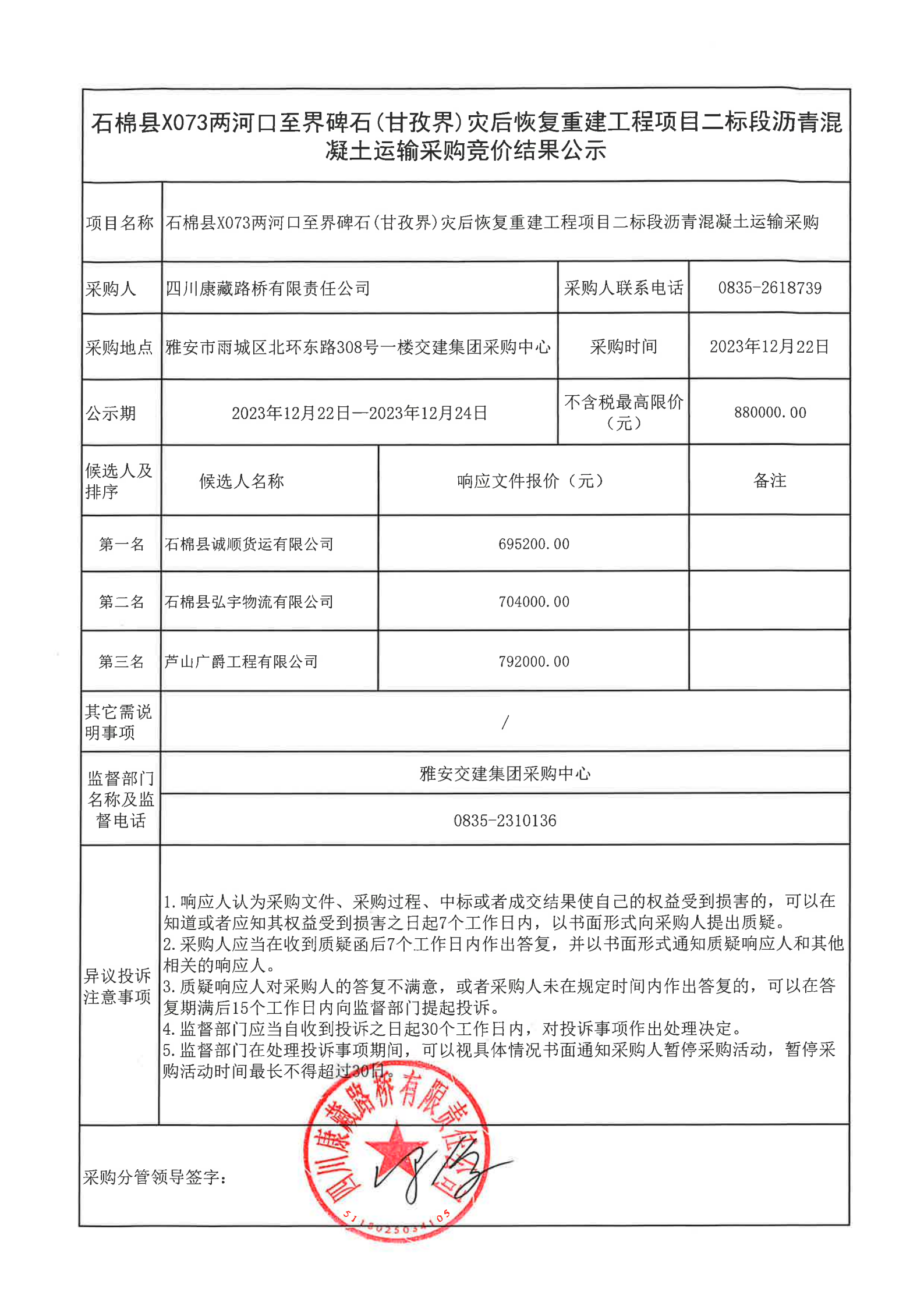 四川康藏路橋有限責(zé)任公司石棉縣 X073 兩河口至界碑石(甘孜界)災(zāi)后恢復(fù)重建工程項(xiàng)目二標(biāo)段瀝青混凝土運(yùn)輸采購競價(jià)結(jié)果公示