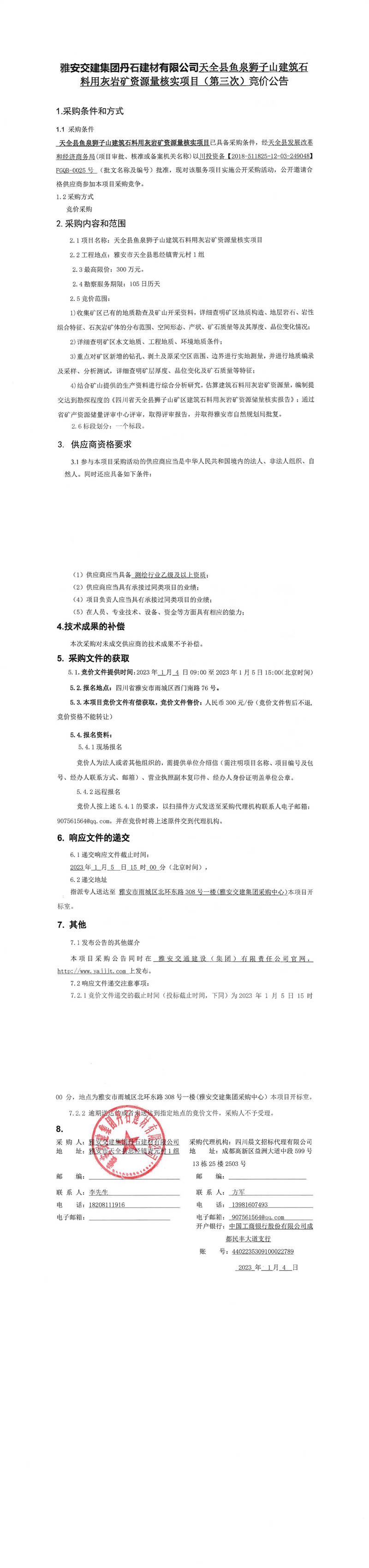 雅安交建集團(tuán)丹石建材有限公司天全縣魚(yú)泉獅子山建筑石料用灰?guī)r礦資源量核實(shí)項(xiàng)目(第三次)競(jìng)價(jià)公告