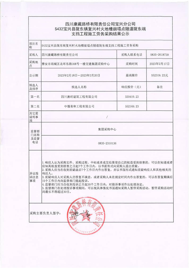 四川康藏路橋有限責(zé)任公司寶興分公司S432寶興縣隴東鎮(zhèn)復(fù)興村火地槽崩塌點(diǎn)隧道隴東端支擋工程勞務(wù)采購結(jié)果公示