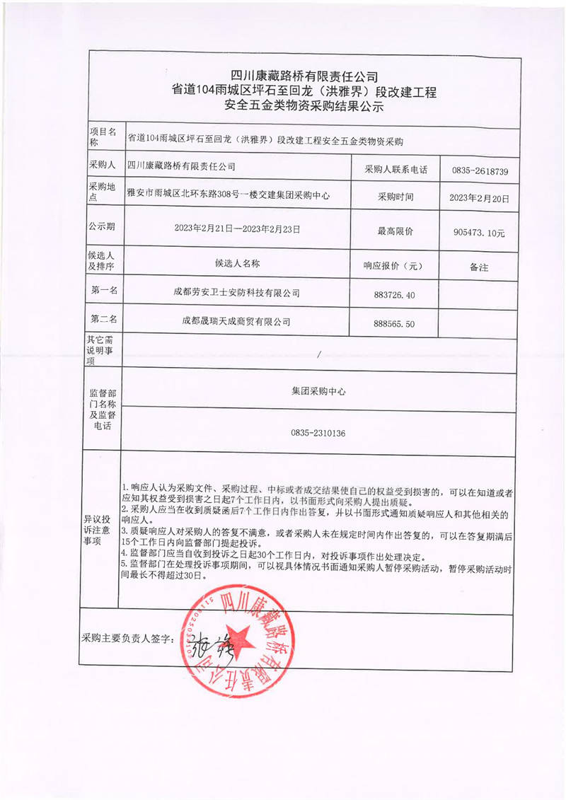 四川康藏路橋有限責(zé)任公司省道104雨城區(qū)坪石至回龍(洪雅界)段改建工程安全五金類(lèi)物資采購(gòu)結(jié)果公示