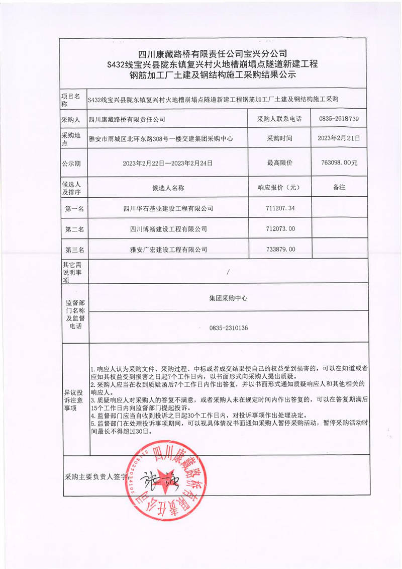 四川康藏路橋有限責任公司寶興分公司S432寶興縣隴東鎮(zhèn)復興村火地槽崩塌點隧道新建工程鋼筋加工廠土建及鋼結構施工采購結果公示
