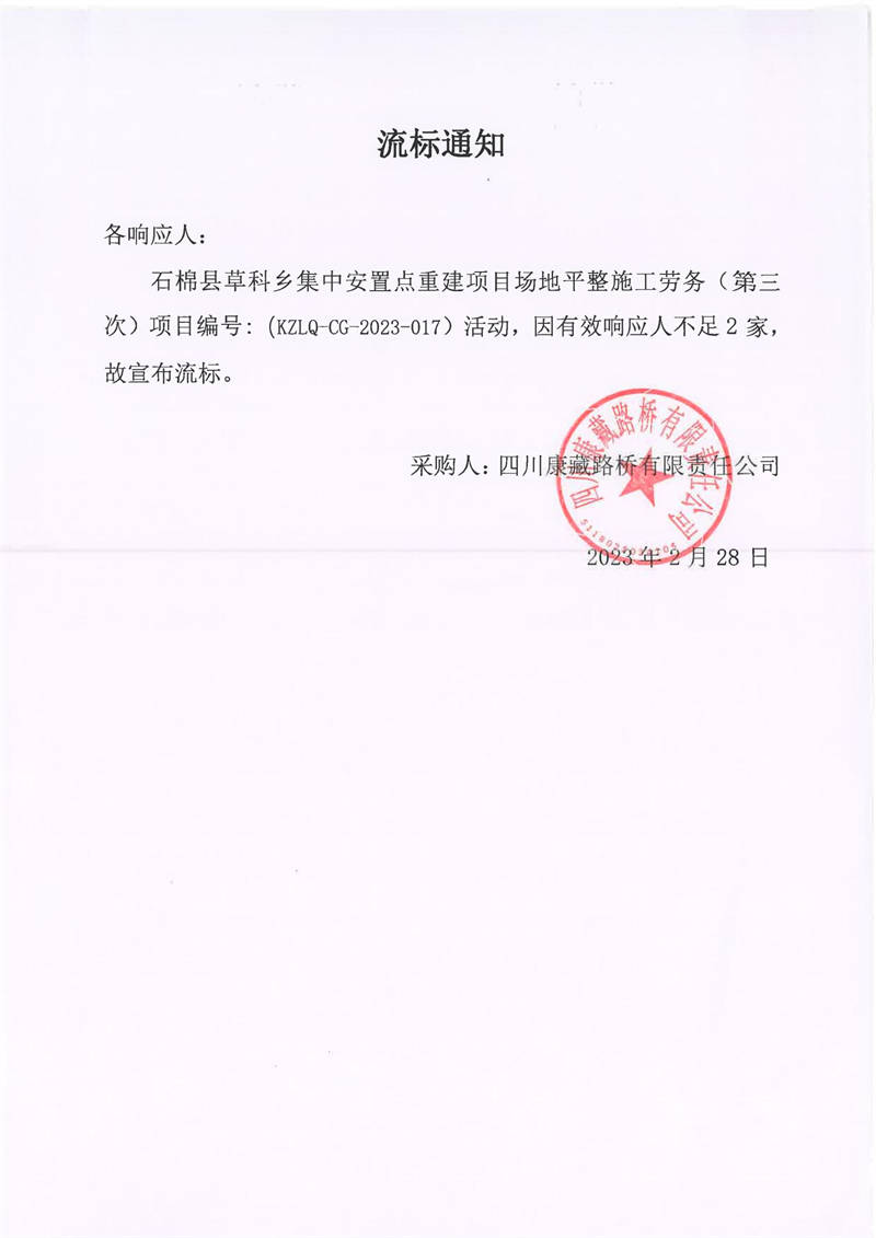 四川康藏路橋有限責(zé)任公司石棉草科鄉(xiāng)集中安置點(diǎn)重建項(xiàng)目場(chǎng)地平整施工勞務(wù)(第三次)庫內(nèi)競(jìng)價(jià)流標(biāo)通知