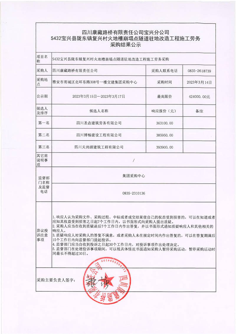 四川康藏路橋有限責(zé)任公司寶興分公司S432寶興縣隴東鎮(zhèn)復(fù)興村火地槽崩塌點隧道駐地改造工程施工勞務(wù)采購結(jié)果公示
