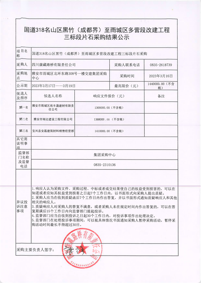 四川康藏路橋有限責(zé)任公司國(guó)道318名山區(qū)黑竹(成都界)至雨城區(qū)多營(yíng)段改建工程三標(biāo)段片石采購(gòu)結(jié)果公示