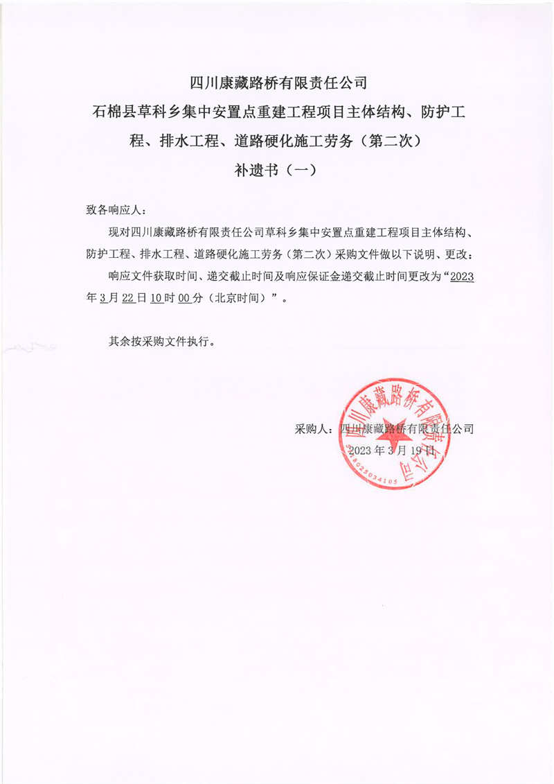 四川康藏路橋有限責(zé)任公司石棉縣草科鄉(xiāng)集中安置點(diǎn)重建工程項(xiàng)目主體結(jié)構(gòu)、防護(hù)工程、排水工程、道路硬化施工勞務(wù)(第二次)補(bǔ)遺書(一)