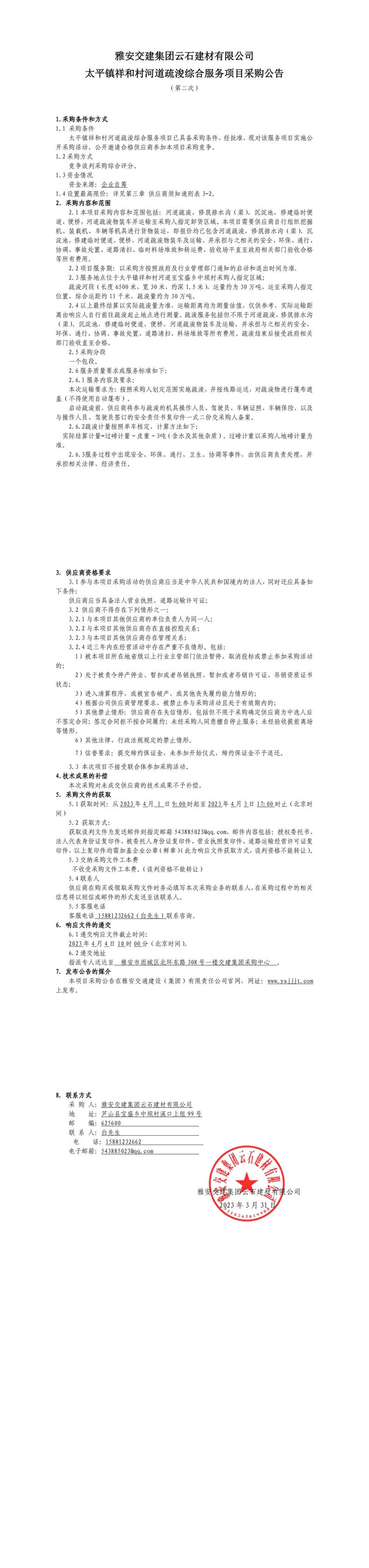雅安交建集團(tuán)云石建材有限公司太平鎮(zhèn)祥和村河道疏浚綜合服務(wù)項(xiàng)目采購(gòu)公告(第二次)
