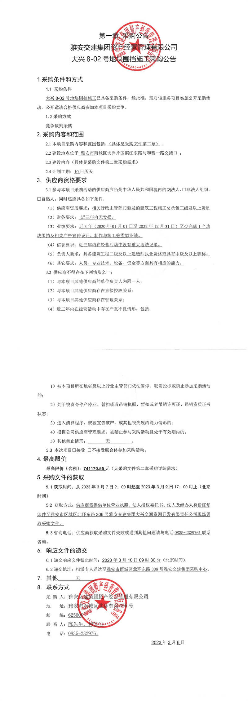 雅安交建集團資產(chǎn)經(jīng)營管理有限公司大興8-02號地塊圍擋施工采購公告