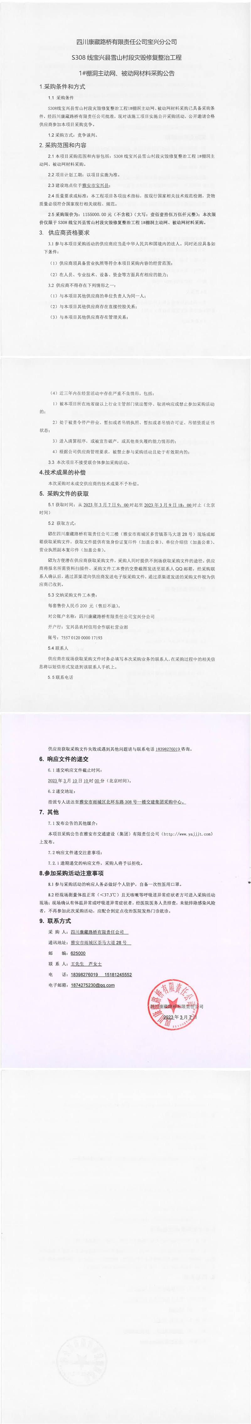四川康藏路橋有限責任公司寶興分公司S308線寶興縣雪山村段災毀修復整治工程1#棚洞主動網(wǎng)、被動網(wǎng)材料采購公告