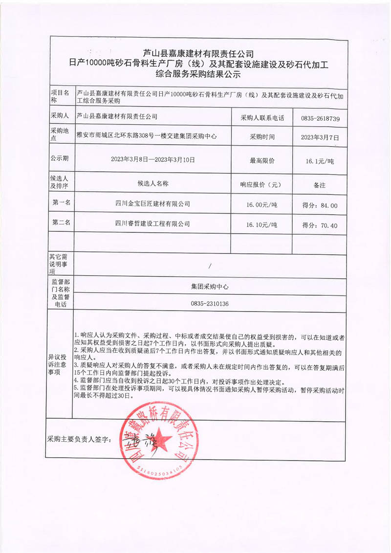 蘆山縣嘉康嘉康建材有限責(zé)任公司日產(chǎn)10000噸砂石骨料生產(chǎn)廠房(線)及其配套設(shè)施建設(shè)及砂石代加工綜合服務(wù)采購結(jié)果公示