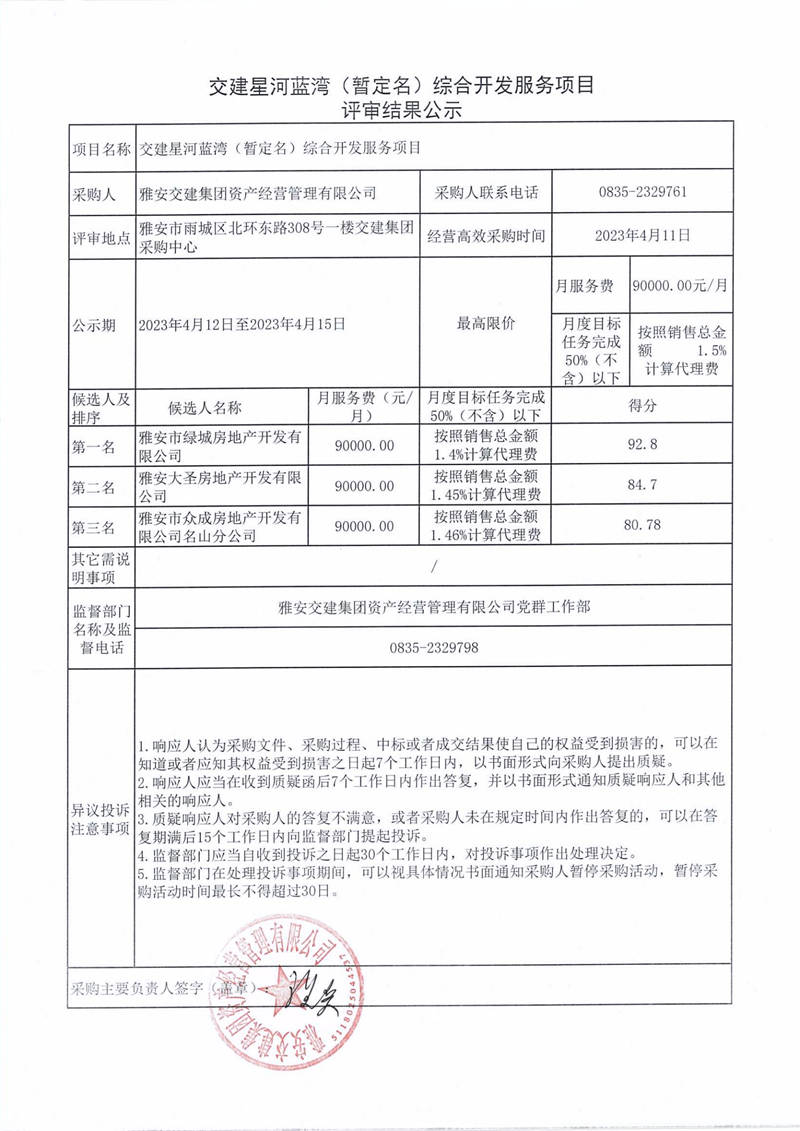 雅安交建集團資產(chǎn)經(jīng)營管理有限公司交建星河藍灣(暫定名)綜合開發(fā)服務項目評審結果公示