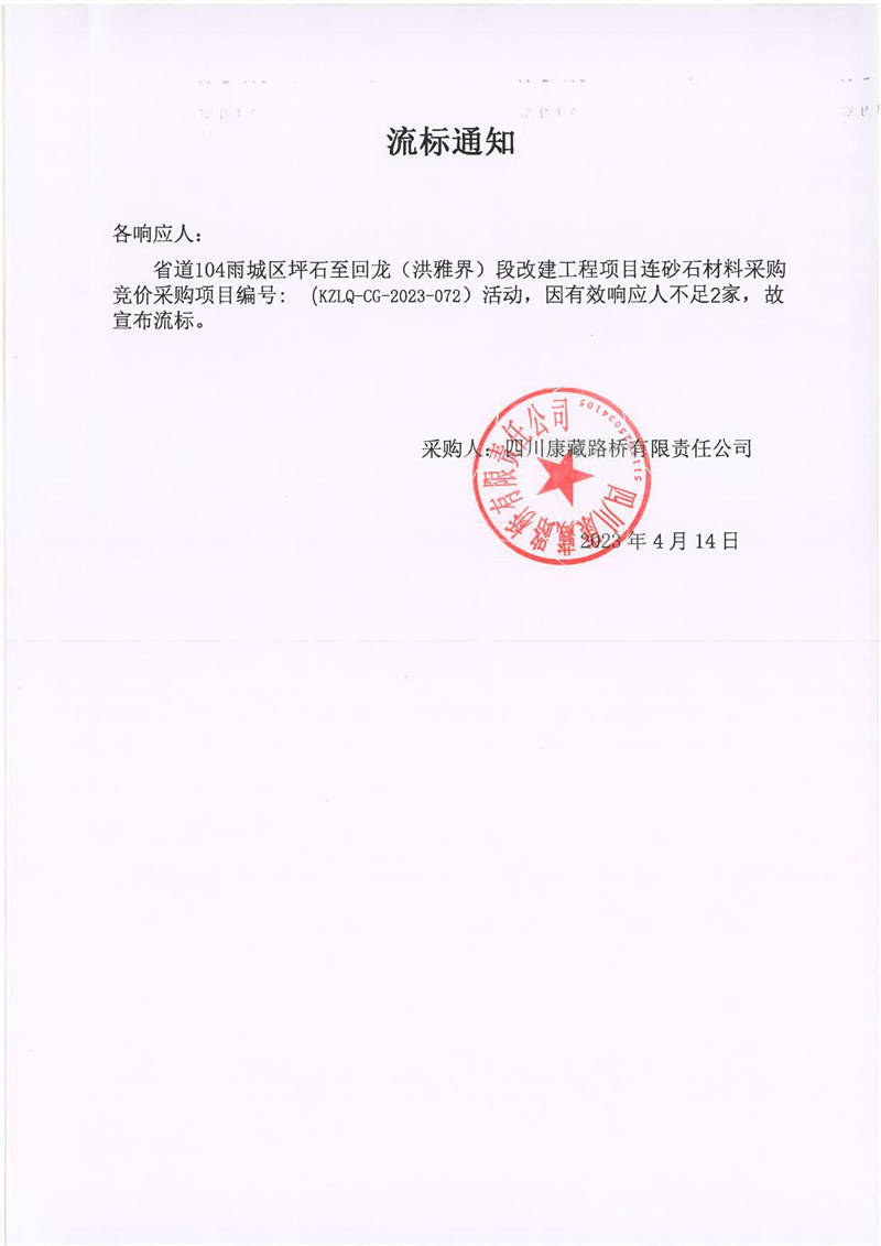 四川康藏路橋有限責(zé)任公司省道104雨城區(qū)坪石至回龍(洪雅界)段改建工程項目連砂石材料采購流標(biāo)通知