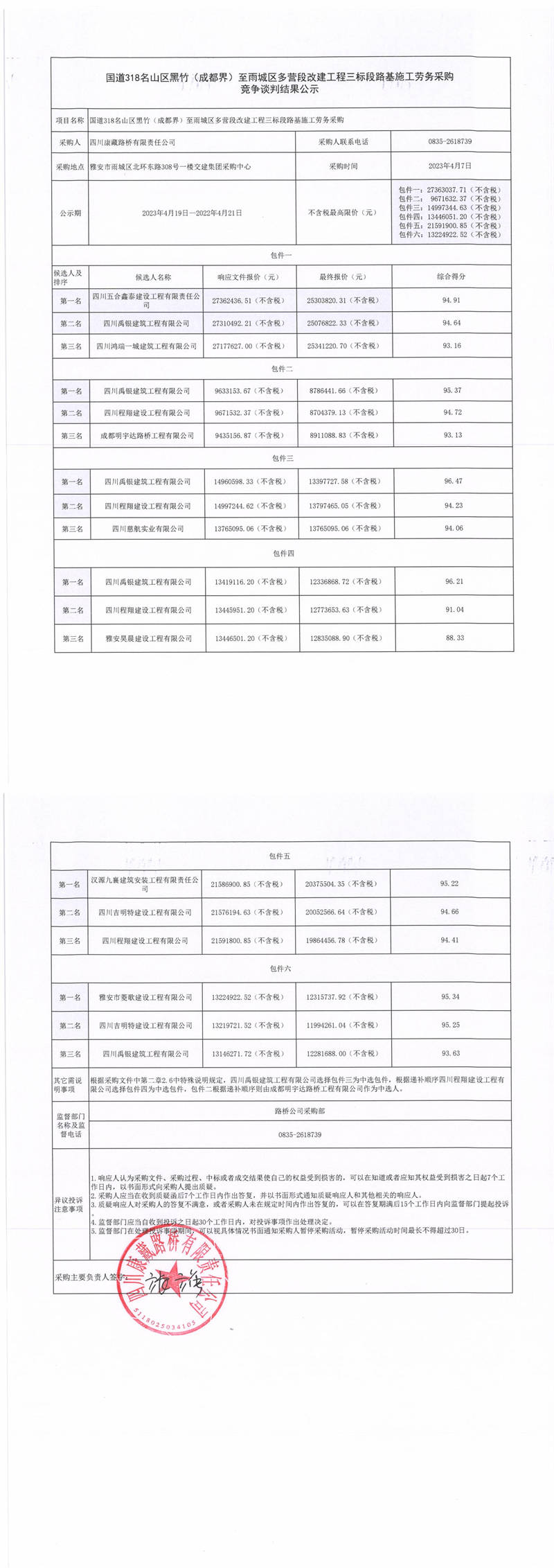 四川康藏路橋有限責任公司國道318名山區(qū)黑竹(成都界)至雨城區(qū)多營段改建工程三標段橋梁施工勞務采購競爭談判結果公示