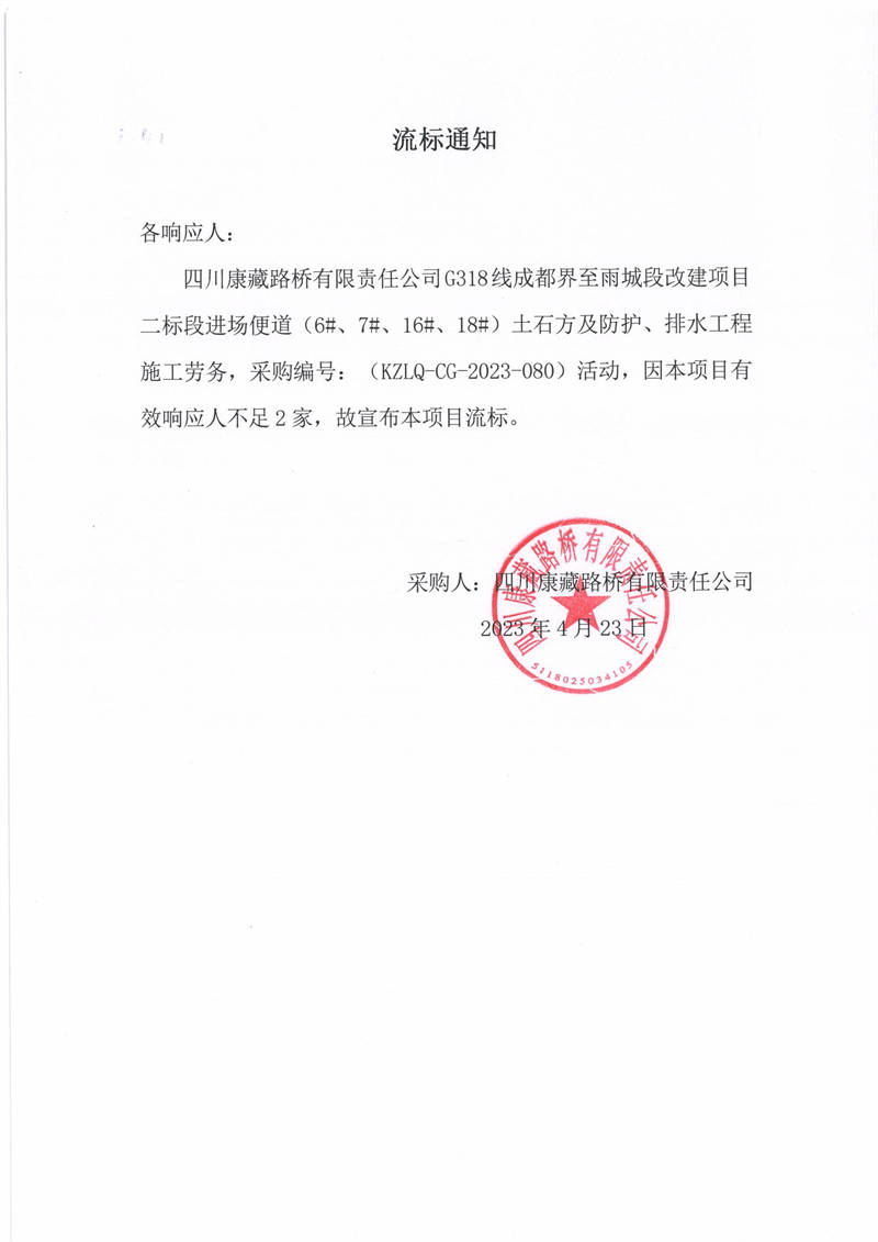 四川康藏路橋有限責(zé)任公司G318線成都至雨城段改建項(xiàng)目二標(biāo)段進(jìn)場(chǎng)便道(6#、7#、16#、18#)土石方及防護(hù)、排水工程施工勞務(wù)流標(biāo)通知