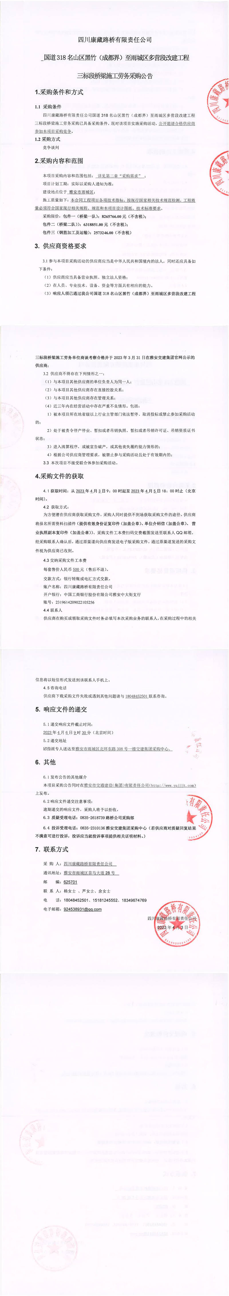 四川康藏路橋有限責(zé)任公司國道318名山區(qū)黑竹(成都界)至雨城區(qū)多營段改建工程三標段橋梁施工勞務(wù)采購公告