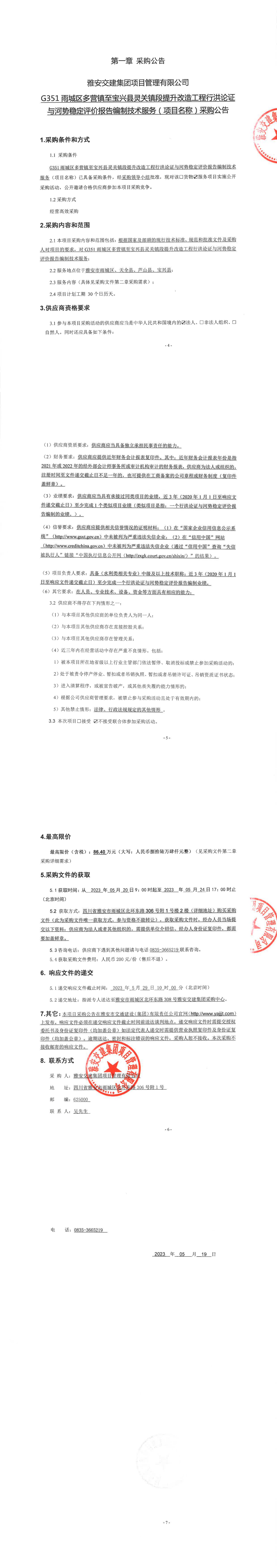 雅安交建集團(tuán)項(xiàng)目管理有限公司G351雨城區(qū)多營(yíng)鎮(zhèn)至寶興縣靈關(guān)鎮(zhèn)段提升改造工程行洪論證與河勢(shì)穩(wěn)定評(píng)價(jià)報(bào)告編制技術(shù)服務(wù)(項(xiàng)目名稱)采購公告