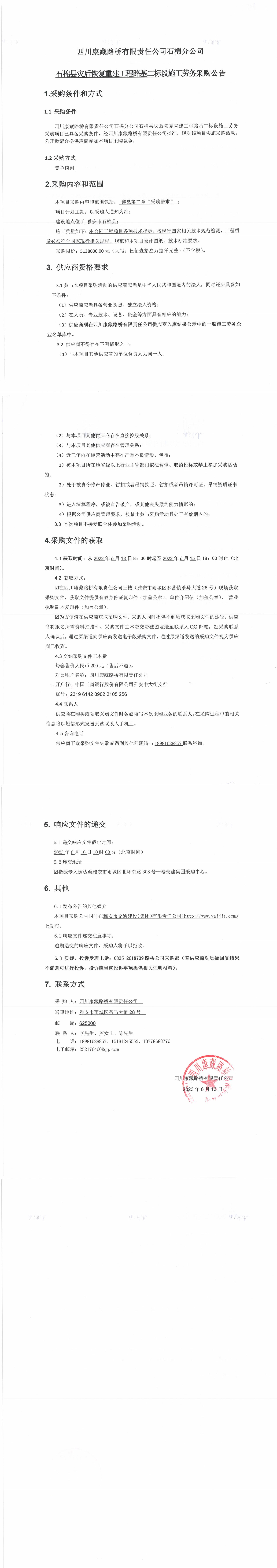四川康藏路橋有限責任公司石棉分公司石棉縣災后恢復重建工程路基二標段施工勞務(wù)采購公告