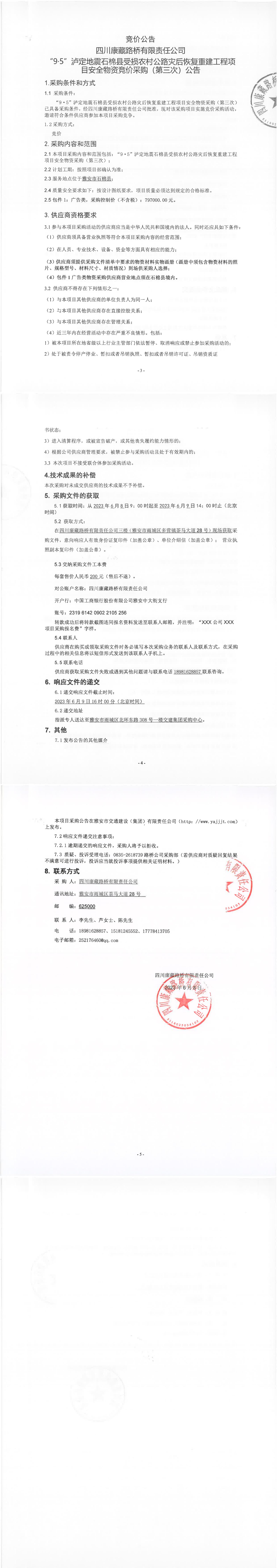 四川康藏路橋有限責(zé)任公司“9·5”瀘定地震石棉縣受損農(nóng)村公路災(zāi)后恢復(fù)重建工程項(xiàng)目安全物資競價(jià)采購(第三次)公告