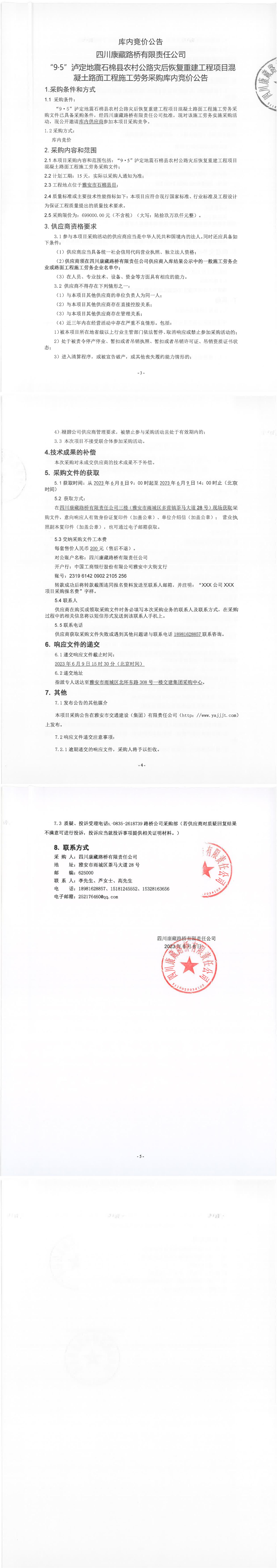 四川康藏路橋有限責任公司“9·5”瀘定地震石棉縣農村公路災后恢復重建工程項目混凝土路面工程施工勞務采購庫內競價公告