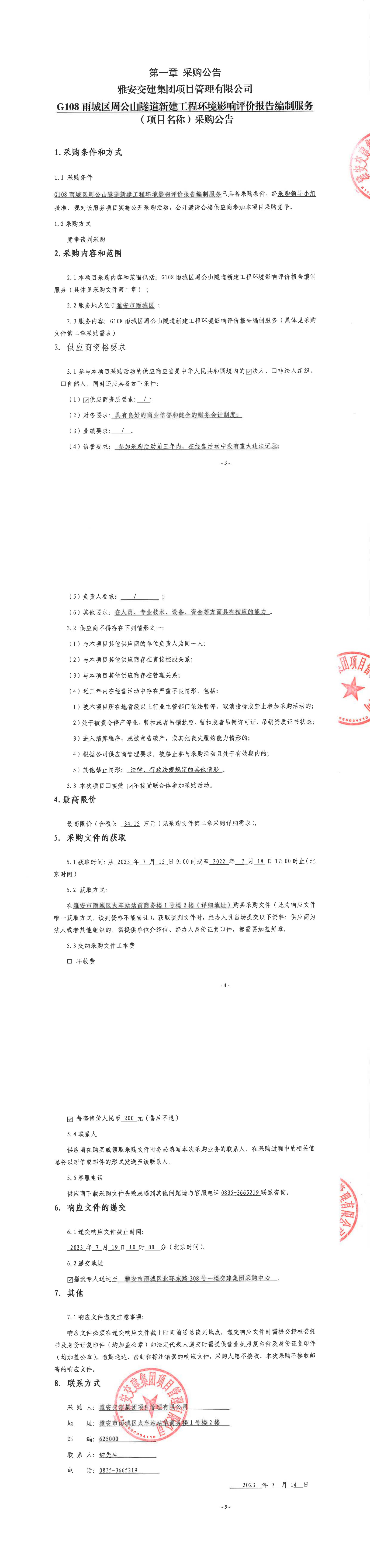雅安交建集團(tuán)項(xiàng)目管理有限公司G108雨城區(qū)周公山隧道新建工程環(huán)境影響評(píng)價(jià)報(bào)告編制服務(wù)(項(xiàng)目名稱(chēng))采購(gòu)公告