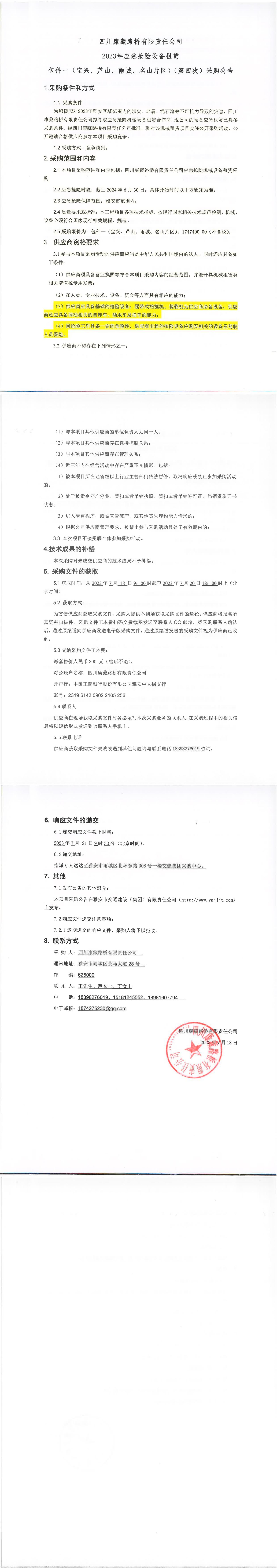 四川康藏路橋有限責任公司2023年應急搶險設(shè)備租賃包件一(寶興、蘆山、雨城、名山片區(qū))(第四次)采購公告